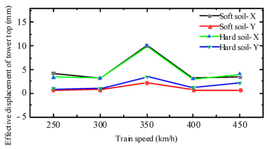 As shown in Figure 29, when the speed is less than 450 km/h, the displacement in the X direction of the transmission tower is always greater than the displacement in the Y direction, which is mainly due to the weak stiffness of the transmission tower in the X direction. Under the ground vibration caused by the vehicle, the transmission tower does not increase linearly with increasing train speed but has a speed that has the greatest influence (350 km/h), mainly because the factors affecting the dynamic response of the structure are not only the amplitude of the time history acceleration but also the duration and frequency components of the ground vibration. Figure 28 shows from the amplitude-frequency diagram of the Y-direction acceleration of the middle ground that with increasing train speed, the main frequency range of the ground vibration gradually approaches the higher frequency band, and the difference between this and the fundamental frequency of the transmission tower will gradually increase. The ground vibration duration acting on the transmission tower-line structure will gradually decrease, so even if the vehicle-induced ground vibration acceleration amplitude will increase with increasing vehicle speed, the dynamic response of the structure will not show a linear increasing trend. Overall, due to the duration and frequency distribution of ground vibration, the effective displacement values of the tower top in the X direction and Y direction under the two kinds of soil are the largest at 350 km/h, which are 10.10 mm and 10.00 mm, respectively.
