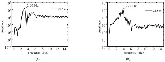 For further analysis, the transfer function of the displacement of the foundation soil to the displacement of the tower top in the X direction and Y direction at 22.5 m under soft soil at 250 km/h are presented in Figure 33. As seen from Figure 33, the overall amplitude levels of the X direction and Y direction are similar, which can also be observed from the effective displacement value of the top of the tower. In addition, the frequency range of higher amplitude is mainly within 2~4 Hz, which is close to the first two natural frequencies of the transmission tower. The peaks of the transfer function in the X and Y directions occur at 2.99 Hz and 3.73 Hz, which is consistent with the first two mode shapes of the transmission tower shown in Figure 18. Overall, the amplitude of the transfer function in the fundamental frequency range of the tower is relatively high, showing an obvious amplification phenomenon. This also indicates that the vibration of the tower is sensitive in this frequency range (2~4 Hz).