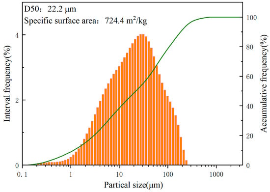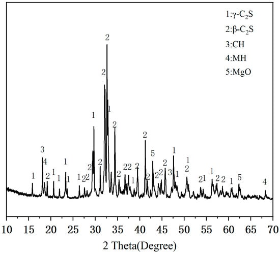 Before the experiment, MS was dried at 105 °C until a constant weight was achieved and then milled using a ball mill. The particle size distribution of the MS powder was analyzed using a Malvern Mastersizer 3000E laser diffraction analyzer, and the specific results are shown in Figure 1. In addition, X-ray diffraction (XRD) analysis of the powder was conducted using a Smart Lab Rigaku X-ray diffractometer to determine the mineral phase composition, as detailed in Figure 2. The main crystal phases identified in MS were dicalcium silicate (C2S), calcium hydroxide (CH), brucite (Mg(OH)2, MH), and MgO.
