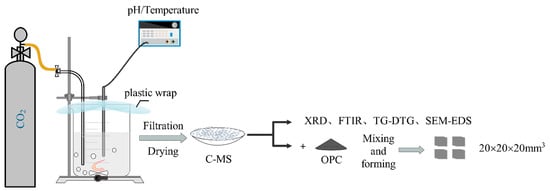 The experimental procedure in this study is illustrated in Figure 3. Firstly, magnesium sulfate (MgSO4) solutions of various concentrations (0.01 mol/L, 0.03 mol/L, 0.05 mol/L, 0.075 mol/L, 0.1 mol/L, 0.2 mol/L, 0.3 mol/L, 0.4 mol/L, and 0.5 mol/L) were prepared by dissolving MgSO4 in deionized water. The MS powder was then mixed with the magnesium sulfate solution at a ratio of 1/40 by magnetic stirring. The apparatus was heated to 80 °C with a stirring rate set at 400 r/min. Throughout the experiment, plastic wrap was used to cover the apparatus to prevent moisture evaporation at high temperatures. After 10 min of stirring, carbonation was initiated by introducing high-concentration CO2 at a ventilation rate of 0.1 L/min/5 g MS using an aeration device. The carbonation reaction lasted for 120 min. Upon completion of carbonation, the suspension was filtered, and the resulting carbonated MS samples (C-MS) were collected and repeatedly washed with ethanol, followed by placement in a vacuum drying chamber at 50 °C.