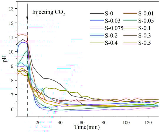 The pH value of the MS suspension was monitored in real time using a precision digital pH meter (REX PHS-3C model) []. Before injecting CO2 into the system, the pH data-recording interval was set to every 30 s. This was done to promptly record the initial pH value of the suspension before the reaction started and observe the changes that occurred over time. Once CO2 injection commenced, the pH data-recording interval was extended to every minute to better cope with the increased reaction rate and the intensity of pH fluctuations.