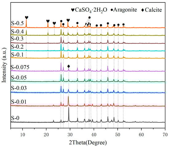 It should be noted that only in the S-0, S-0.01, S-0.03, and S-0.05 experimental groups, the peak at 874 cm−1 represents the υ2 vibration of the S-O bond, indicating the presence of calcite. However, as the MgSO4 concentration increases, the intensity of this peak gradually weakens until it completely disappears in the S-0.075 experimental group. This indicates that when the MgSO4 concentration is below 0.075 M, both aragonite and calcite crystalline forms coexist in the generated calcium carbonate. Once the concentration exceeds this range, the calcite vibrational peak disappears, and a vibrational peak corresponding to dihydrate gypsum appears at 3300 cm−1 []. The intensity of this peak increases with the MgSO4 concentration, while calcite becomes the dominant crystalline phase of calcium carbonate, which is consistent with the results shown in Table 2.