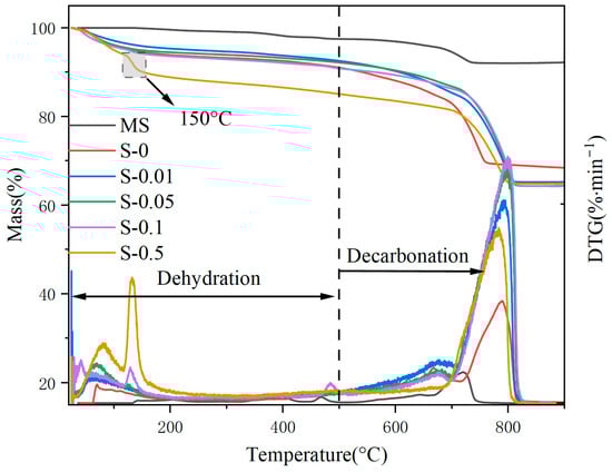 The DTG curve of MS clearly shows the thermal decomposition peak of calcium carbonate, indicating that the raw material MS has undergone a slight carbonation reaction with atmospheric CO2 during transportation, leading to the formation of calcium carbonate. Furthermore, compared to the control group S-0, the DTG curves of the experimental groups show an obvious increase in the peak intensity of aragonite decomposition between 700 and 800 °C with the increase in MgSO4 concentration. When the MgSO4 concentration reaches 0.1 M, the DTG curve of the experimental group S-0.1 exhibits a dehydration weight loss peak of CaSO4·2H2O at 150 °C, with the highest peak intensity observed at 0.5 M [,,]. This indicates that when the MgSO4 concentration is below 0.1 M, the carbonation products of MS mainly consist of calcium carbonate and gel, while when the MgSO4 concentration exceeds 0.1 M, a new phase, CaSO4·2H2O, appears in the products, and the peak intensity increases with the MgSO4 concentration.