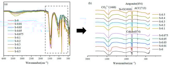 According to the results in Figure 7b, peaks corresponding to the out-of-plane bending vibration (υ4) and asymmetric stretching vibration (υ3) are observed at 854 cm−1 and 1460 cm−1, respectively. Particularly, in the S-0 experimental group, the vibrational peaks of aragonite are visible, further confirming that aragonite can be generated in MS through wet carbonation in a pure water environment. As the MgSO4 concentration increases, the intensity of the aragonite vibrational peaks also increases.