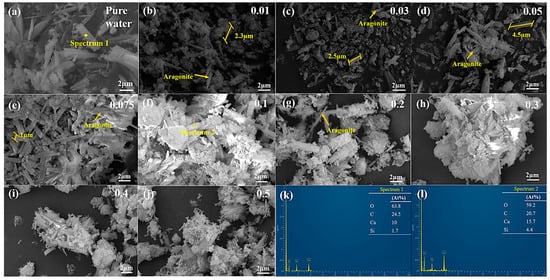 SEM image of MS carbonated with different MgSO4 concentrations ((a) 80 ℃ pure water, (b) 0.01 M, (c) 0.03 M, (d) 0.05 M, (e) 0.075 M, (f) 0.1 M, (g) 0.2 M, (h) 0.3 M, (i) 0.4 M, (j) 0.5 M, (k) EDS 1, (l) EDS 2).