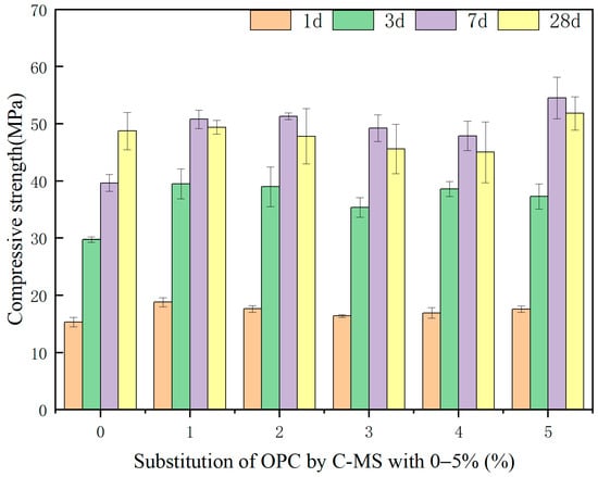 The results indicate that at a curing time of one day, the compressive strength of the experimental group is similar to the control group. At three and seven days, the compressive strength of the experimental group is generally higher than that of the control group. Particularly, at a substitution level of 5%, the compressive strength of the experimental group increases by 37.5% at seven days, reaching 54 MPa. This suggests that the addition of C-MS significantly enhances the early strength of cement paste, primarily due to the filling effect of carbonates and the accelerated hydration reaction of cement at early stages [].