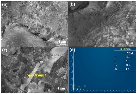 Additionally, in the experimental group (c), distinct rod-shaped aragonite can be observed, surrounded by numerous calcite crystals and hydration products. Based on the above results, it can be concluded that the improvement in compressive strength of the cement paste is attributed to the introduction of carbonates, which provide nucleation sites for the formation of hydrated products (C-S-H) and accelerate the hydration reaction of the cement paste, leading to an increase in hydration products [,,]. Furthermore, the interaction between calcite and aragonite enhances the internal structure of the paste, reduces porosity through the filling effect, and further improves the compressive performance of the cement paste []. This is consistent with the compressive strength results.