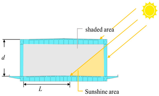In the sunshine model, due to the continuous variation in the sun’s height, the lower deck becomes covered by the upper deck, resulting in a lateral temperature difference. Hence, it is imperative to establish a shading model for the upper deck, as depicted in Figure 1.