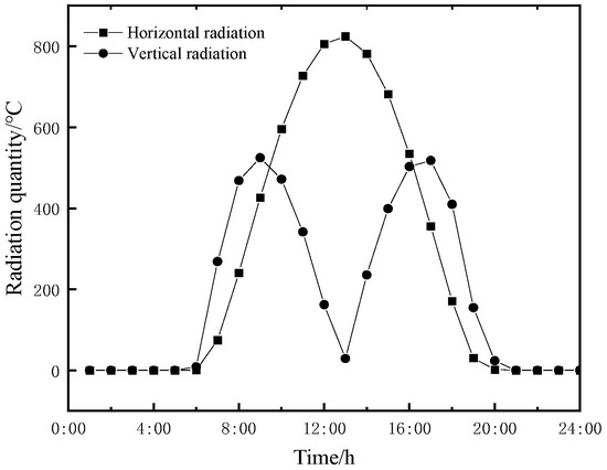 The radiation parameters in this article are based on data obtained during the summer solstice of 2022, specifically on the 188th day of the year and with a solar inclination angle of 23.44°. The bridge is situated at a latitude of 33°42′ N and a longitude of 107°36′ E, spanning from south to north directionally. The solar radiation incident upon different components of the bridge varies due to their respective angles ranging between 0° and 90°, resulting in diverse levels of radiant intensity. Figure 2 illustrates the temporal variation curve depicting both horizontal and vertical radiant intensities.