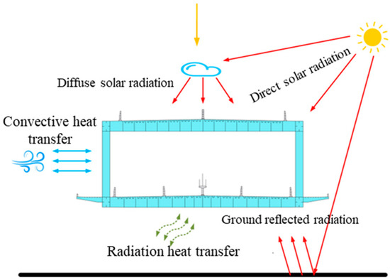 The heat exchange mode of the outer boundary of the model is divided into three types: solar radiation, convective heat transfer, and radiation heat exchange. The heat exchange model is shown in Figure 3.