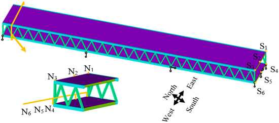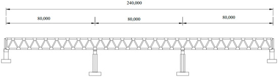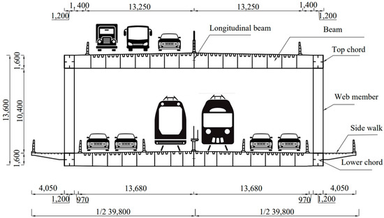 The research focuses on a double-layer steel truss continuous girder, which consists of a 3 × 80 m steel truss continuous girder with separate layers for highway and railway purposes, as illustrated in Figure 4. The primary truss is designed as a triangular structure with a center spacing of 30.5 m and a truss height of 12 m. Both the upper and lower chords of the main truss are box-shaped sections with dimensions of 1200 mm (width) and 1600 mm (height), and with a plate thickness of 30 mm. The diagonal web members adopt an I-shaped section, while the straight web members utilize a box-shaped section measuring 1200 mm (width) and 1000 mm (height), and having a plate thickness of 36 mm. For the upper and lower bridge decks, they consist of cross beams, longitudinal beams, and orthotropic bridge decks. All cross beams and longitudinal beams are inverted T-shaped sections with respective heights of 1600 mm (cross beam) and 800 mm (longitudinal beam). Additionally, the wing plates have widths measuring 720 mm (cross beam) and 400 mm (longitudinal beam), as depicted in Figure 5.