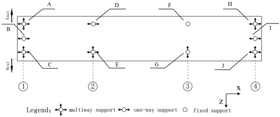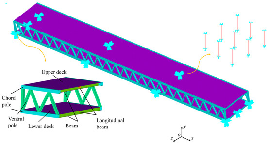 An advanced simulation model of a three-span double-layer steel truss continuous girder is established using the general-purpose finite element software ANSYS 2021. To improve both the accuracy and computational efficiency of the temperature analysis, the SHELL131 element is utilized. This element consists of four nodes, each node capable of handling up to 32 temperature degrees of freedom, making it well-suited for three-dimensional steady-state or transient analysis. In contrast, for structural analysis, the SHELL181 element is employed, characterized by its four nodes, where each node has six degrees of freedom. The simulation model of the double-layer steel truss continuous girder is illustrated in Figure 6, whereas Figure 7 presents the mechanical boundary conditions of the simulation model.