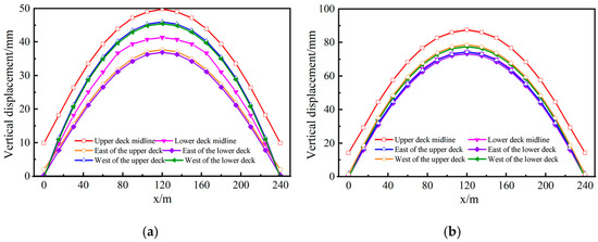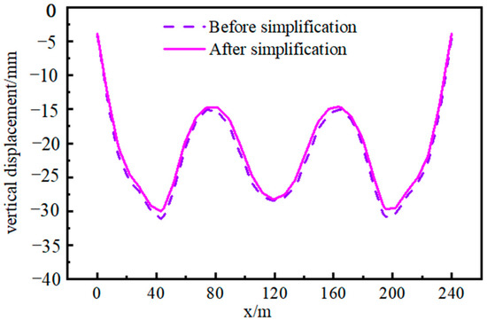 The model is simplified in two ways. Firstly, the calculation of the sidewalk slab is disregarded in the model analysis. However, its shielding effect on the bottom chord cannot be overlooked. As depicted in Figure 8, there is minimal disparity observed in the vertical displacement of the structure before and after simplifying the sidewalk board. Secondly, to account for the frame effect of a double-layer bridge deck, an equivalent thickness is assigned to simplify the U-shaped bridge deck as an equally thick bridge deck. The formula used for calculating this equal plate thickness is: