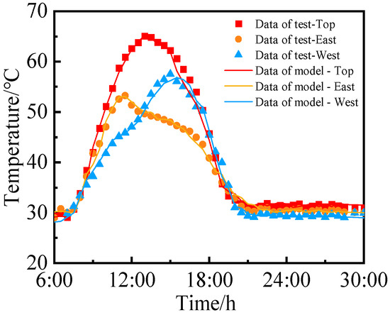 The test data obtained from the steel box girder segment experiment conducted by Tong was selected to validate the numerical model [32]. The validation results of the temperature analysis are presented in Figure 10. Upon comparing the on-site test data with the finite element simulations, it can be concluded that there is a consistent time point at which the top plate, east side, and west side of the steel box girder reach their maximum temperatures. Furthermore, the difference between these two sets of results is within 2.22%. It is evident that the temperatures predicted by our model exhibit excellent agreement with those measured during testing.