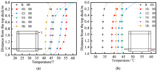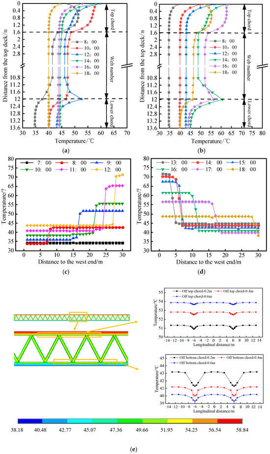 The vertical temperature distribution, as depicted in Figure 11a,b, exhibits an uneven pattern along the east–west direction with a noticeable temperature gradient. Specifically, during the period from 8:00 to 12:00, the eastern region of the steel truss experiences direct sunlight exposure, while, from 14:00 to 18:00, it shifts to the western region. The observed temperature gradient primarily manifests in areas adjacent to the upper chord top plate and side plate, as well as between the upper chord and web, and lower chord and web. The transverse temperature distribution, as depicted in Figure 11c,d, exhibits a discernible correlation between the lower deck’s temperature and the shading effect. Notably, the shaded area experiences significantly lower temperatures compared to the unshielded region, leading to a distinct stepped temperature gradient. At its peak, the lateral temperature difference can reach up to 29.73 °C at 13:00. The temperature in the shaded areas is primarily influenced by the ambient temperature, whereas the temperature in the unshaded areas is predominantly affected by solar radiation. In terms of the longitudinal temperature distribution (as depicted in Figure 11e), apart from the vicinity near the connections of chord and web members, the temperatures at each point along the same height of the steel truss are equivalent. A slight temperature gradient exists near the connection points of the steel truss. Near the bottom chord, the longitudinal temperature difference decreases as the distance from the bottom chord increases. Similarly, near the top chord, the longitudinal temperature difference diminishes with increasing distance from the top chord. Based on the data comparison, it is evident that heat transfer in the connection area is more significantly influenced by the lower chord than by the upper chord.