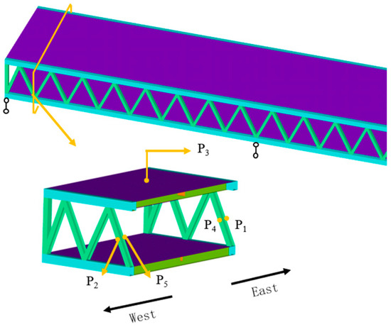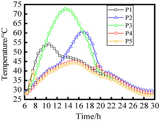 To further investigate the time-varying temperature law of the entire structure, five characteristic points were selected for temperature analysis. The position and temperature change pattern of these characteristic points are illustrated in Figure 12 and Figure 13, respectively. Figure 12 shows that characteristic point P1, situated on the outer side of the web member, experiences a rapid increase in temperature between 6:00 and 10:00, reaching a maximum value of 54.15 °C at 10:00, followed by a subsequent decrease in temperature. Characteristic point P2, located on the outer side of the western web member, exhibits a gradual warming trend between 6:00 and 10:00, primarily influenced by environmental temperatures. However, during the period from 12:00 to 16:00, it undergoes a significant rise in temperature due to the solar radiation impact with a peak value of 60.91 °C observed at 16:00. The upper bridge level’s characteristic point P3 demonstrates continuous and rapid heating since 6:00 until reaching its maximum value of 71.21 °C at 13:00. Thereafter, the temperature decreases as the radiant intensity diminishes. Feature points P4 and P5 are positioned on the inner side of both eastern and western web members, respectively. Their respective temperature changes exhibit overall gentleness, mainly affected by environmental temperatures. However, a notable increase in the heating rate is observed near 18:00 and 8:00 under direct sunlight exposure. From these observations, it can be concluded that solar radiation significantly impacts surface temperatures across this structural system.
