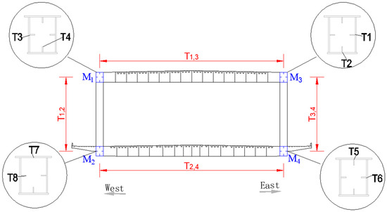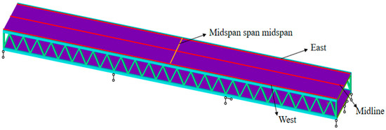 The bridge structure exhibits a significant structural response under the daily temperature cycle. The displacement of the bridge can be categorized into three components: vertical, horizontal, and longitudinal displacements. To extract displacement data, three representative longitudinal lines are selected: the centerline, east and west lines, and the transverse line in the middle span, as depicted in Figure 20. The vertical displacement is positive in the upward direction and negative in the downward direction. The horizontal displacement is positive towards the east and negative towards the west. The longitudinal displacement is positive outwardly and negative inwardly.