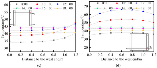 Temperature distribution of east chord section. (a) Temperature distribution of T1. (b) Temperature distribution of T6. (c) Temperature distribution of T2. (d) Temperature distribution of T5.
