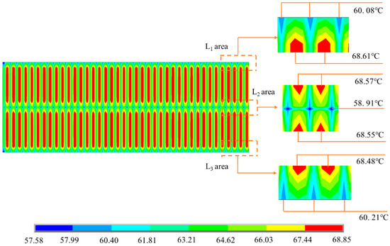 The temperature distribution pattern of the upper deck remains have selected the temperature distribution of the bridge deck at 12:00 as an illustrative example. Figure 16 depicts the grid-like temperature distribution across the entire upper deck. Due to heat transfer effects, the bridge deck will conduct heat transfer like low-temperature longitudinal beams, cross beams, and chords, resulting in a temperature gradient and a grid-like temperature distribution on the bridge deck. The temperature difference between regions L1 and L2 is smaller than that within region L2, indicating a more rapid temperature change in region L2.