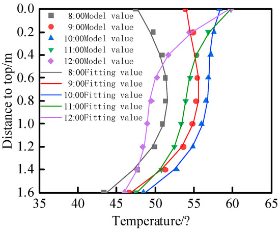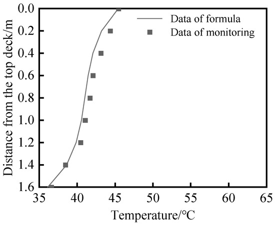 The 11:00 temperature data of the upper chord box girder of Chongqing Chaotianmen Bridge was selected to validate the proposed temperature gradient formula in this study [33]. The main truss chord of Chongqing Chaotianmen Bridge is a welded box section, available in two variations, 1200 mm and 1600 mm in width. The section height ranges from 1240 mm to 1840 mm, with a plate thickness varying between 20 mm and 50 mm. The main structural material employed is Q420q steel. Due to the difference in the maximum temperature between the literature [33] and the paper, a reduction coefficient (0.76 is adopted here) needs to be considered when calculating component temperatures. Figure 19 illustrates the comparison of the temperature results, demonstrating that the calculated results in this paper align with the linear temperature gradient observed in [33], with a correlation coefficient (R2 = 0.9889), thus confirming the formula’s feasibility.