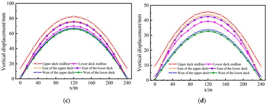 Vertical displacement curve of double-layer bridge deck at different time points. (a) 10:00. (b) 12:00. (c) 14:00. (d) 16:00.