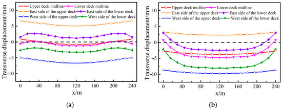 Under the combined influence of the solar radiation angle and support constraints, the position of the maximum lateral displacement changes, as illustrated in Figure 22. Both sides of the upper deck are horizontally offset, while, in the middle span, the lower deck is horizontally offset to both sides and curved to both sides in the side span. There are differences in the distribution patterns of lateral displacement between them. Under the solar radiation influence, the bridge deck temperature rises and expands outward. The direction of the lateral deviation of the center line is determined by the side of the steel truss with a high solar radiation intensity.