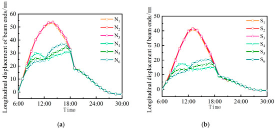 The end of the continuous girder was marked by selecting twelve specific points, as illustrated in Figure 23. The time-varying curves depicting longitudinal displacement at each of these points under extremely high temperatures are presented in Figure 24a,b. The comparison reveals a consistent changing trend between the south and north ends of the girder. Notably, the outward elongation value at the northern end surpasses that at the southern end. The time variation curve of the longitudinal displacement of the point is analyzed by taking the north end of the continuous girder as an example. For the upper deck, the longitudinal displacements of N1, N2, and N3 are consistent. Under solar radiation, each point is heated and expanded, reaching a maximum of 54.14 mm at 14:00 and then entering the descending stage; for the lower bridge deck, the longitudinal displacements of N4, N5, and N6 are consistent during 6:00~8:00. After 8:00, affected by the angle of solar radiation and shading, the degree of thermal expansion of the three positions was different. The girder end exhibits a complex structural configuration and experiences intricate stress states.