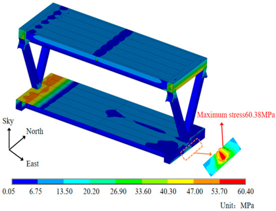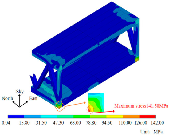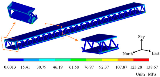 The stress distribution of the edge support and middle support sections under the action of all-day sunlight are shown in Figure 26 and Figure 27, respectively. The comparative analysis reveals that the shading effect of the component induces an uneven temperature field, leading to varying degrees of thermal expansion in the steel truss. Consequently, this phenomenon significantly impacts the distribution of stress. The trend of maximum stress variation is the same for the edge fulcrum and middle support section. The stress of the edge fulcrum and the middle fulcrum section were maximized at 14:00, which were 141.48 MPa and 60.38 MPa, respectively. The maximum stress of the edge support section exceeds that of the middle support section at each point.