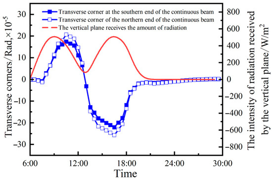 The observation of Equation (15) reveals that, as the longitudinal displacement of support 1 surpasses that of support 3, with an increasing difference between them, the lateral angle of the girder end initiates a progressive increment. The lateral rotation angle of the north and south ends of the continuous girder remains relatively stable during nighttime, as depicted in Figure 28. During the period of 10:00~12:00, an increase in the solar radiation angle leads to a gradual reduction in the lateral angle at the girder end. After 12:00, the sun gradually moves towards the west. The longitudinal displacement of support 3 exceeds that of support 1. Additionally, the transverse angle of the girder end becomes negative and reaches its minimum value at 17:00. Subsequently, it gradually approaches zero.