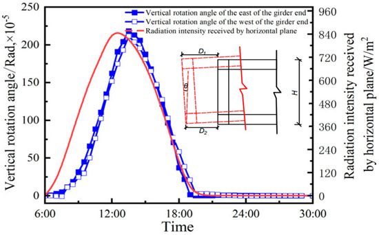 The changing trends and values of the lateral and vertical rotation angles of the girder ends exhibit significant disparities, as evident from Figure 28 and Figure 29, owing to distinct influencing factors governing their variations. The lateral angle of the girder end is primarily determined by the radiation intensity received on the vertical plane, while the vertical rotation angle of the girder end is predominantly influenced by the radiation intensity received on the horizontal plane. The inclination of the girder end increases proportionally with escalating radiation intensity.