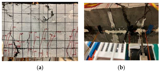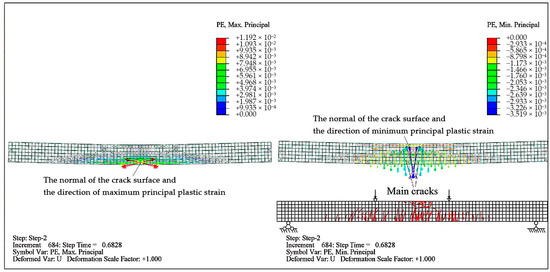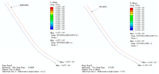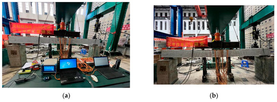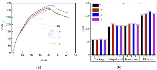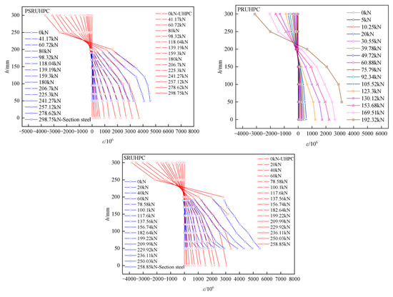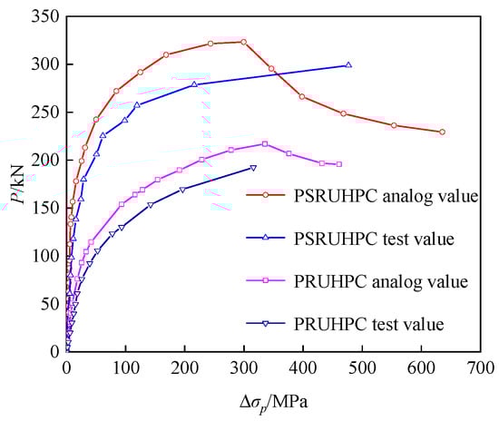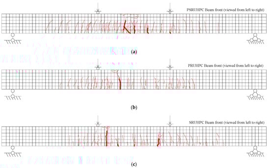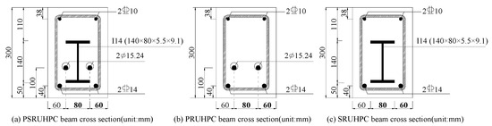 - The test results show that the bending processes of unbonded prestressed steel UHPC (PSRUHPC) beams are similar to those used for ordinary reinforced concrete beams, and UHPC crushing in the compression zone is a sign of failure. Due to the tie effect of steel fibers, the crushed concrete still maintained good integrity, and there was no fragmentation phenomenon; after cracking, the concrete in the tension zone remained functional, and the cracking inflection point of the load–deflection curve was not obvious. The presence of I-shaped steel endowed the PSRUHPC beam with good deformation performance. The application of prestress significantly improved the stiffness of the beam before cracking. The cracking loads of the three test beams accounted for each of their ultimate loads, which were higher than those seen in ordinary concrete beams, and they displayed higher bearing capacities before cracking. At the same height, the change trends of the strain in the section steel and UHPC were roughly the same. After most of the section steel had yielded under tension, the strains of the two deviated, but they were shown to generally work together.