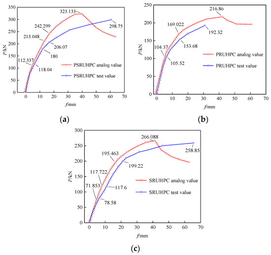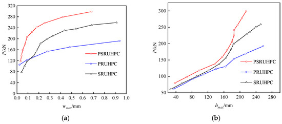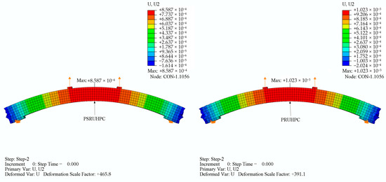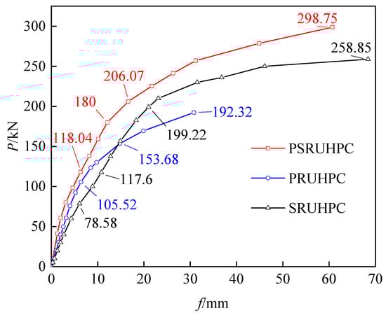 - The PSRUHPC beam showed a significantly improved bearing capacity, and its bending ductility performance was improved. Compared with PRUHPC beams, PSRUHPC beams showed a bearing capacity increase of 55.3%, a cracking load increase of 11.9%, and a displacement ductility coefficient increase of 76.2%. Compared with SRUHPC beams, PSRUHPC beams showed a 15.4% increase in bearing capacity, a 50.2% increase in cracking load, and a 12.1% increase in displacement ductility coefficient.