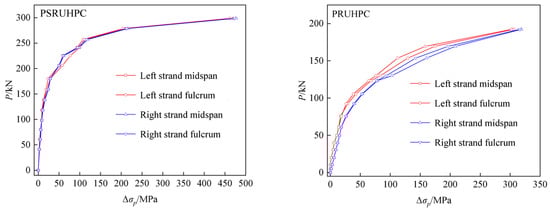 - The magnetic flux sensor cable force monitoring system was shown to more effectively monitor the strand stress increment of the unbonded prestressed steel UHPC beam; the load–strand stress increment curves were basically the same as the load–deflection curves, and the stress increment of the steel strand was positively correlated with the midspan deflection.