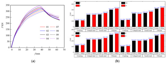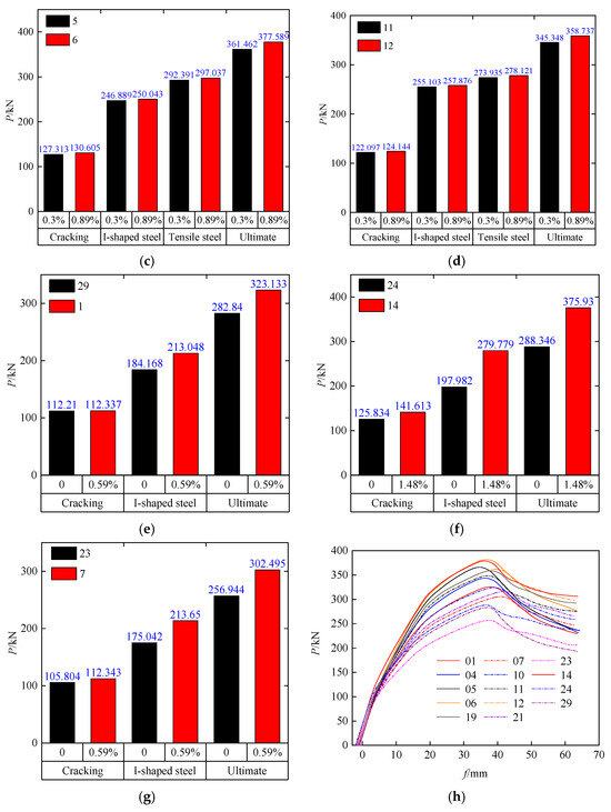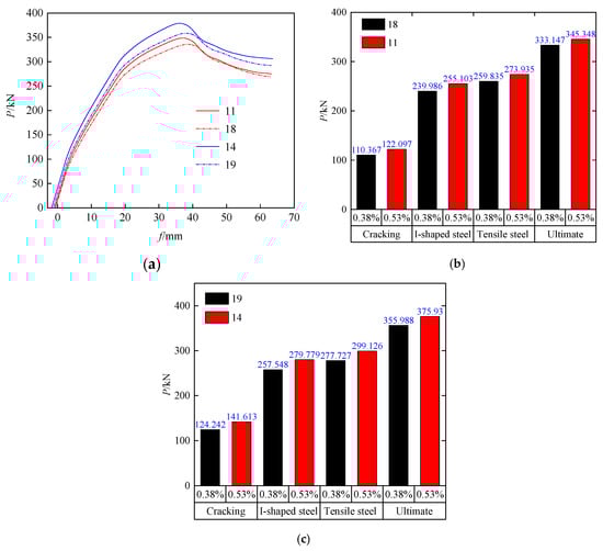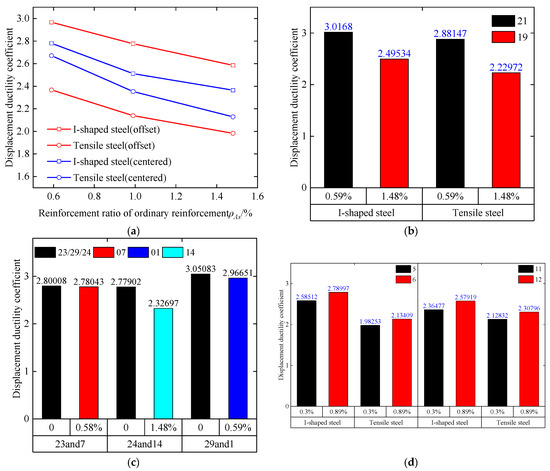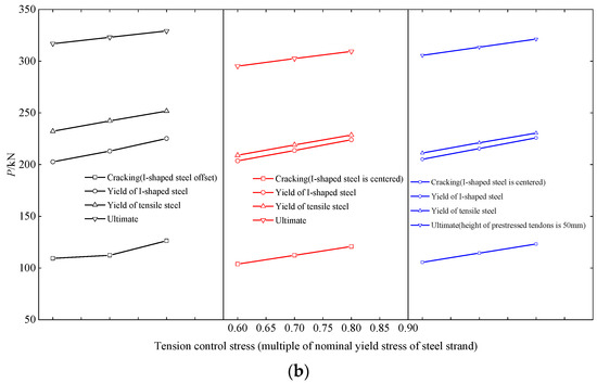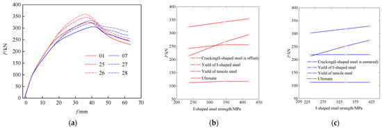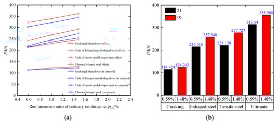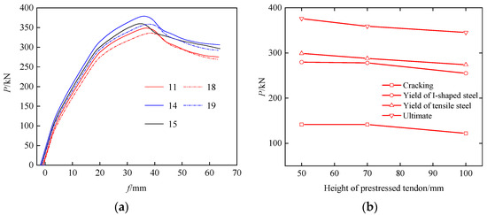 - The simulation results show that the reinforcement ratio and the shaped steel content ratio of an ordinary longitudinal reinforcement had a greater impact on the yield load and ultimate load, and the reinforcement ratio of the prestressed reinforcement had a greater impact on the cracking load. Increasing the effective prestress significantly decreased the bending ductility of the beam. As the section steel and the prestressed tendons in the section moved downwards, the beam’s bearing capacity increased, but its bending ductility decreased. After incorporating high-strength steel, the yield load and ultimate load were significantly increased, but the flexural ductility properties of the beam showed a nonlinear, decreasing trend.
