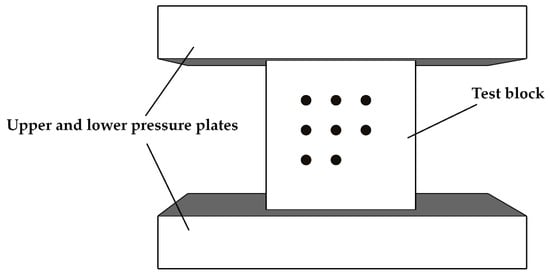 The measurement of rebound values should be conducted in accordance with JGJ/T 294—2013 []. Clean the test block, place two opposite sides of the molded surface between the upper and lower pressure plates of the press, applying a pressure of 60 to 100 kN (determined by interpolation), and maintain this pressure. On each of the two opposite sides of the specimen, perform 8 rebound impacts, as shown in Figure 1. From a total of 16 rebound readings, discard the highest 3 and lowest 3 values and calculate the arithmetic average of the remaining 10 readings as the rebound index R of the specimen, calculated to the nearest 0.1. After measuring the rebound values, load the test block to failure. For the layout of the rebound measurement points and the placement of test blocks, refer to the diagram shown in Figure 1.
