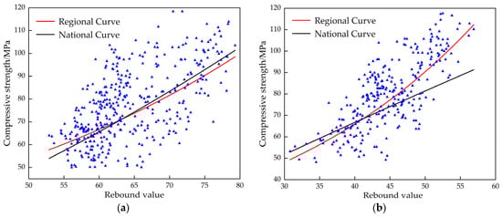 The interrelationship between the regression curves of the two rebound hammers, the estimated values from the national curve, and the measured compressive strength. (a) Comparison between the national strength curve for the 4.5 J rebound hammer and the regional curve in Xinjiang; (b) Comparison between the national strength curve for the 5.5 J rebound hammer and the regional curve in Xinjiang. The blue triangle is a set of data consisting of rebound value and compressive strength.