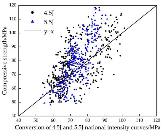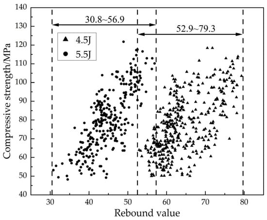 Furthermore,  is an important parameter for determining the testing accuracy of the rebound hammers. It reflects the change in high-strength concrete’s compressive strength for a unit change in the rebound value. A smaller  can indicate a flatter slope of the curve, which implies a higher testing accuracy. Conversely, higher  values suggest a lower testing accuracy []. The calculated results are shown in Table 10. In this experiment, the  value for the 4.5 J high-strength rebound hammer is 2.59 MPa, and for the 5.5 J high-strength rebound hammer, the  value is 2.92 MPa. This further indicates that the 4.5 J high-strength rebound hammer has a higher accuracy and testing precision when assessing high-strength concrete.