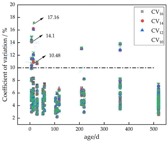 The summary of coefficient of variation at various ages is illustrated in Figure 3. It provides an overview of the coefficient of variation at different ages. Notably, within the initial 28 days, the coefficient of variation for high-strength concrete is significantly higher than in other stages, exceeding 10%. This occurrence might be attributed to the early stage of compressive-strength development in high-strength concrete, leading to irregular development in surface hardness among different specimens, resulting in a coefficient of variation greater than 10%. As the concrete ages, the strength tends to stabilize, and the coefficient of variation typically reduces to below 10%. When testing high-strength concrete structures, components that have not attained the designed strength within the initial 28 days should be allowed to age until the strength stabilizes before conducting the tests.