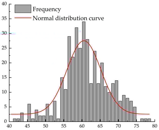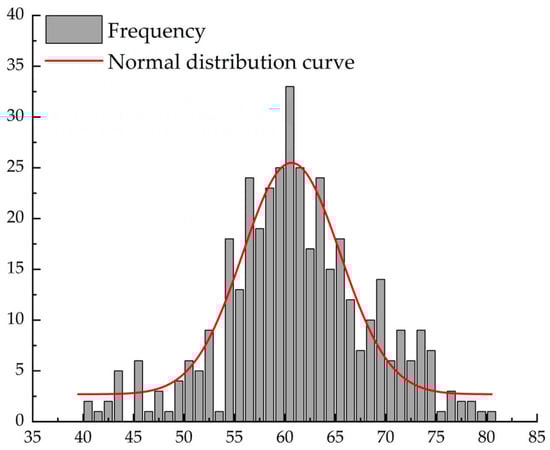 The analysis results from Table 11 and Table 12 indicate that the rebound representative values obtained using the three data processing methods are close to the values obtained from the JGJ/T 294—2013 [] standard. In other words, the data distribution curves obtained from the three data processing methods, which include the 16 original rebound values, are generally consistent. We will now focus on the normal distribution histogram for the C50 standard rebound data and the average of the 10 rebound data points, according to the standard procedure. The frequency histogram of the rebound values and the normal distribution curve can be seen in Figure 6 and Figure 7.