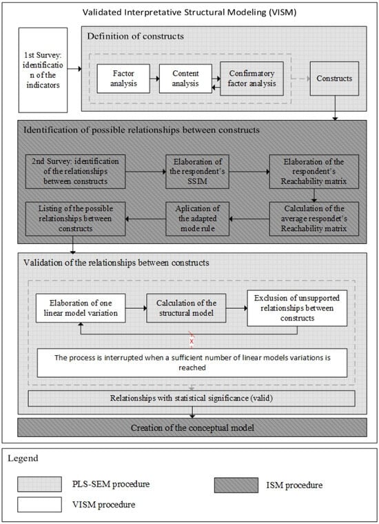 Once possible relationships between constructs have been identified, these relationships are checked for statistical significance. This is a key step in the VISM technique and aims to add the reliability of PLS-SEM models to ISM models. To achieve this, linear models will be constructed containing the potential relationships between constructs and then tested for statistical significance using bootstrapping procedures, following Santana et al.’s [78] guidelines. According to the author, we should adopt the following five conditions for the creation and testing of linear models used to validate relationships between constructs: