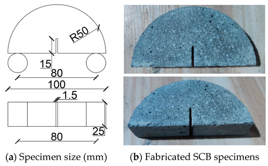 A semicircular bend geometry (SCB) test was carried out according to AASHTO specifications. Considering the relevant research of scholars at home and abroad [30,31,32,33,34], the size of the SCB specimen was determined as 100 mm in diameter, 25 mm in thickness, 15 mm in incision depth, and 0.8 times in diameter and selected as the fulcrum spacing of this test. The specific details are shown in Figure 2.