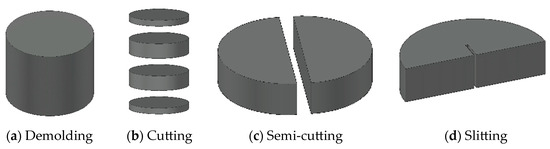 The molding method of the specimen was achieved by mixing the concrete according to the previous determination of the matrix mix ratio, pouring it in a cylindrical mold with a height of 60 mm, a diameter of 100 mm, and an oiled inner wall, molding after 24 h, and placing it into the standard curing room for curing. After seven days of curing, the cylindrical specimens were sliced, and the concrete at the top and bottom was removed. Only the 2 × 25 mm part of the central part was taken; the “round cake” was cut in half, and then 15 mm joints were cut out. The specific specimen-making method is shown in Figure 3.