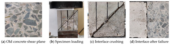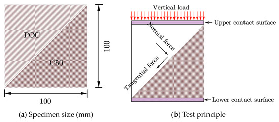 In the interface compression–shear test of the PCC material, a C50 concrete block with an age of more than 200 days was used, and the size of the concrete block was a cube with a side length of 100 mm. The size and test principle of the specimen is shown in Figure 4. Through the diagonal contact surface of the specimen, the vertical load and the self-weight of the upper half could be decomposed into a tangential component and normal component on the interface so that the compressive shear force was generated on the contact surface and the compressive shear test of the interface was realized. Considering that the old concrete needed to be cut in the actual expansion joint repair process, the old concrete block was cut along the diagonal line with a cutting machine, and the cutting surface was polished to make it a continuous plane. The loading rate is 1 mm/min [35].