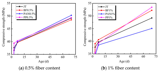 The compressive strength test of each specimen at 3 d, 7 d, and 70 d was carried out. The results are shown in Figure 5. The compressive strength of PAN fiber was slightly higher than that of each specimen at the age of 70 d under the dosage of 0.5%, but when the dosage was increased to 1%, the compressive strength of PAN was significantly lower than that of other specimens. This reason is that too many small PAN fibers hinder the connection of the PCC matrix. From Figure 5b, it can be seen that the highest compressive strength of 70 d was PP1%, which is 53.4 MPa. Both BF1% and PP1% increased the compressive strength of the matrix, while PAN1% significantly reduced the compressive strength of the matrix. In Figure 5a, the fiber has a positive effect on the compressive strength of the material in the case of low content. The influence of fiber content on compressive strength at different ages is the same. The addition of a small amount of PAN fiber improved the flow performance of the material and then improved its strength. However, after the addition amount was increased, the defects in the cementitious material increased due to the low elastic modulus and large fiber section of the PAN fiber, thus reducing the pressure resistance of the material. However, when the age reached 70 days, as the hydration reaction of the matrix ended, the incorporation of PP fiber was positively correlated with the compressive strength.