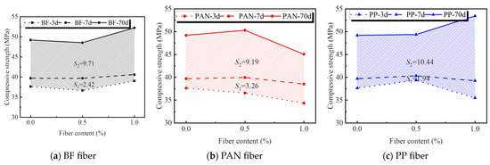 The effects of different fibers on compressive strength at different ages can be seen in Figure 6. For BF fiber, at different ages (3 d, 7 d, 70 d), with the increase in fiber content, the compressive strength of the specimens decreased slightly and then increased (overall increase). For PAN fiber, it increased slightly first and then decreased (overall increase); for PP fiber, at the early stage (3 d, 7 d), the compressive strength of the specimens increased slightly and then decreased with the increase of fiber content, and at the later stage (70 d) continued to increase. Comprehensively comparing the improvement effect of each fiber at each age, the shadow area in Figure 6 was used to quantify the improvement effect of this type of fiber on the compressive strength at this age. At the early age stage (3 d to 7 d), the compressive strength improvement effect of PAN fiber was the largest, almost 1.5 times that of PP fiber, while during the later age stage (7 d to 70 d), the improvement effect of PP fiber was slightly higher than that of the other two fibers. Based on the above analysis, increasing the content of BF fiber has a positive effect on improving the compressive strength, while increasing the content of PAN fiber harms compressive strength improvement. For PP fiber, the increase in compressive strength at an early stage is negative, while the later stage is positive. Therefore, considering the different expectations of compressive strength at different stages, it is necessary to select the appropriate fiber.