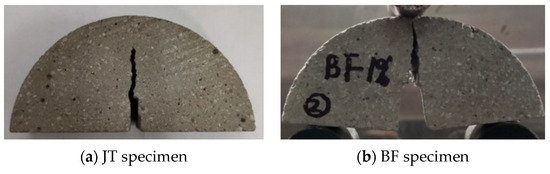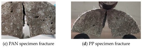 As shown in Figure 7, the early stage, the JT specimen changes very little. However, when the load–displacement curve reaches its peak, a crack extending from the end of the slit to the contact point of the indenter suddenly appears. The specimen fails after rapid crack propagation, and the section of the specimen is perpendicular to the lower contact surface. For BF specimens, after the load–displacement curve reaches its peak, cracks begin to appear and extend slowly. An obvious fiber connection can be seen on the fracture surface, and there is no obvious broken fiber. Most of the fibers are due to pull-out failure. For PAN specimens, the crack propagation speed is faster than that of BF specimens after the load–displacement curve reaches its peak. Fine fibers can be seen on the fracture surface of PAN specimens, and some fibers still connect two sections. Finally, in the PP specimen, the load–displacement curve is the same as the first two before reaching the peak, but the specimen can still bear a small force when the crack continues to expand. Even if the matrix is almost disconnected, the remaining part of the specimen can still withstand the load, and there is a clear “coupling” effect. The fracture surface of PP shows that some fibers are still connected to two sections, and some fibers are observed to be broken. The addition of fiber can reduce the degree of brittle cracking of the material. Among them, the influence of BF fiber and PAN fiber on the material has certain similarities. After the material is cracked, it is not the same as that of PP fiber. Even if the material has cracked, many fibers are still coupling.