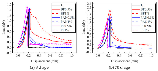 The SCB test curve is shown in the following figures. Figure 8 shows that when the specimen begins to bear force, there is a small nonlinear curve segment, which then increases linearly until it reaches the ultimate load. After reaching the ultimate load, almost straight down a small section, the curve is about a negative power function decline, infinitely close to zero. As shown in Figure 8a, in the early stage (8 d), the influence of fiber content and the presence or absence of fiber on the peak load is not obvious. This is because the cement matrix of PCC material has not been completely hydrated in the early stage, and has not been effectively combined with various fibers, which makes the initial cracking stage and peak load between various specimens. There is no significant difference, but in the later stage, BF fiber and PAN fiber have significantly delayed the generation of cracking displacement, while PP fiber is too small, and there is not much difference in delaying cracking from the JT without fiber group. PP fiber mortar does not show the effect of inhibiting crack propagation like BF and PAN in the curve shape. The above reasons are due to its small elastic modulus or failure under the influence of hydration heat. In Figure 8b, the peak load increases with the increase of fiber content, but after the crack is generated, due to the complete reaction of cement, the failure position appears when various fibers are broken or pulled out, so that after the load reaches the limit, the material quickly fails, and the curve falls vertically to zero.