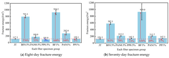 As shown in Figure 10a, the fracture energy distribution of various mortars is as follows: The average fracture energy of JT specimens at 8 d is 117.3 J/m2. Except for 0.5% PP fiber, the fracture energy of other fiber specimens is improved to varying degrees. The improvement effect is BF1% specimen >BF0.5% specimen >PAN1% specimen >PAN0.5% specimen >PP1% specimen. The fracture energy of the PP0.5% specimen is slightly decreased by 14% compared with JT, which is due to the poor high-temperature stability of the PP specimen with 0.5% volume content, which fails in the reaction of cement hydration heat, which does not increase the fracture energy of the material but decreases because of the increase in internal defects. The fracture energy of the PP1% specimen is slightly increased compared with JT, indicating that the reason for qualitative change caused by quantitative change is reflected between the volume content and fracture energy of the PP specimen. The fracture energy of PAN0.5% and PAN1% specimens increased compared with JT. The fracture energy of BF0.5% and BF1% specimens increased to nearly 600% compared with JT. The BF fiber in the mortar has a very obvious contribution to the increase in the fracture energy of the mortar compared with the other fibers in the mortar at the same age. Secondly, PAN fiber also has a positive effect on the increase in its fracture energy. However, PP fiber has limited contribution to the increase in fracture energy and may even play a negative role.