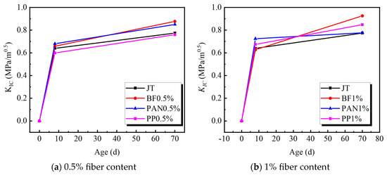 As shown in Figure 11, the fracture toughness of matrix JT at 8 d is about 0.63 MPa·m0.5; the fracture toughness of the PP0.5% specimen is slightly lower than that of JT. The reason is that the high-temperature stability of the PP0.5% specimen is poor, and it fails in the reaction of cement hydration heat, which does not increase the fracture toughness of the material. The fracture toughness of matrix JT at 70 d is between 0.77 MPa·m0.5; the fracture toughness data of each fiber are relatively uniform. When the volume fraction of these fibers is less than 1%, the effect on the fracture toughness of the matrix is limited, and there is no obvious enhancement or weakening. From the perspective of incorporation amount, BF fiber generally contributes a lot to the improvement in fracture toughness at the later stage. This is because the addition of BF fiber reduces the fluidity of the material and slows down the hydration reaction rate, resulting in material fracture. The incorporation of PAN fiber is positively correlated with the early fracture toughness of the material, but more than 1% of the content slightly reduces the fracture toughness of the material. PP fiber is opposite to PAN fiber. More than 1% content can greatly improve the fracture toughness of the material. This shows that when the content of PP fiber is less than 0.5%, the contribution to the introduction of material defects is greater than the contribution to crack resistance. From an age point of view, the fracture toughness of the material increases with time. In general, BF fiber improves the fracture toughness of the material more than other types of fibers, and the higher the content, the more obvious the effect on the later fracture toughness. A small amount of PP fiber (0.5%) slightly reduces the fracture toughness of fast-hardening PCC material, but when the content reaches 1%, the fracture toughness is improved.