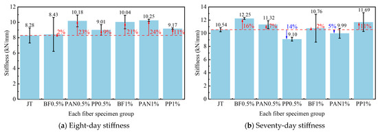 As shown in Figure 13a, the average stiffness of the JT matrix of the control group at 8 d is 8.28 kN/mm; the incorporation of 0.5% BF and 0.5% PP fibers increased the stiffness by only 2% and 9%, respectively, while the incorporation of 0.5% PAN fiber greatly increased the stiffness (23%), and the stiffness increase corresponding to 1% PAN fiber content was only 1%. The increase was only 1%, which indicates that 0.5% PAN fiber can also improve the stiffness well in the case of low content, and for BF and PP fibers, only by increasing the content, the stiffness of the specimen was greatly improved (BF fiber: 2% to 21%; PP fiber: 9% to 24%). As shown in Figure 13b, the average stiffness of the JT matrix in the control group at 70 d was 10.54 kN/mm, which was 27% higher than that at 8 d. The addition of 0.5% BF fiber increased the stiffness by 16%, and the improvement effect was obvious. For PAN fiber, the incorporation of 0.5% increased by 7%. When the content reached 1%, the stiffness decreased by 5%. The reason is that with the increase in content, the fibers between the matrix were not completely dispersed, hindering the reaction of the hydrogel and the connection of the aggregate. The above shows that from the perspective of improving the stiffness of the specimen, adding 0.5% PAN fiber at 8 d is better, and adding 0.5% BF fiber at 70 d is the best.